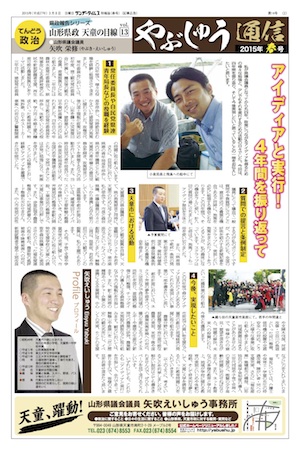 その思いで30歳で天童⻘年会議所に⼊会。まちづくりをしていく中で、思い通りにいかないことや「もっとこうすればいいのに」といったことが多数ありました。しかし、ただ政治⾏政への不満を陰で⾔っているのはかっこ悪い、⾃分の施策を提⾔する⽴場になって、責任をもって意⾒しよう、と思い⽴ち、天童市議会議員に⽴候補しました。その後、⼭形県議会に⽴候補しましたが初⼼は変わりません。